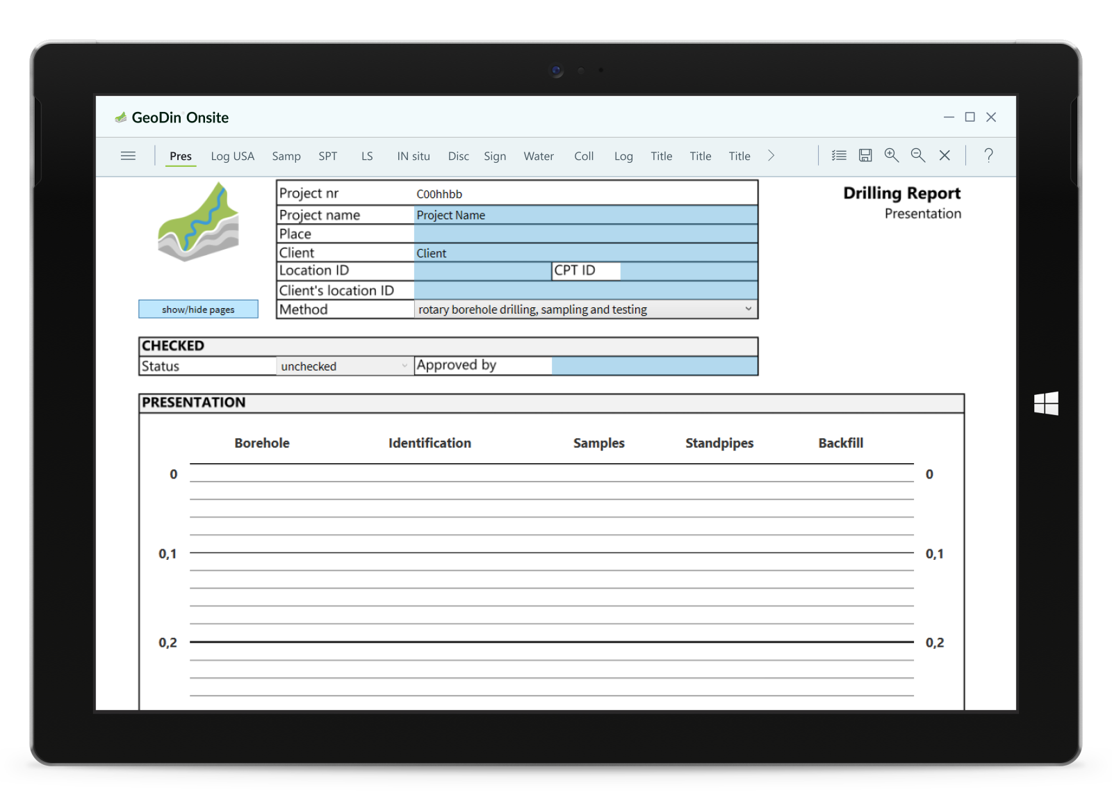 GeoDin Onsite transforms traditional paper-based field data collection into an efficient digital workflow. Designed specifically for geotechnical drilling operations, this Windows-based application brings the simplicity of paper forms to digital tablets with powerful validation and integration capabilities.